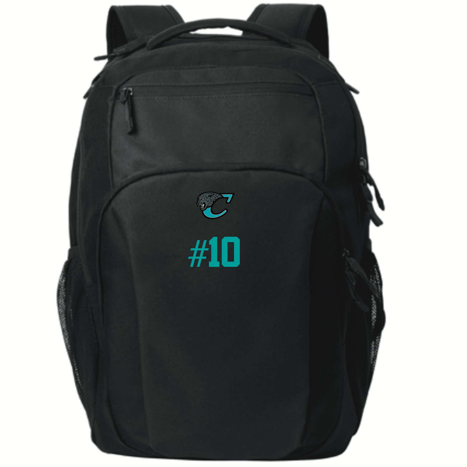 black backpack with 2.5" Century embroidered patch and player number in vinyl.